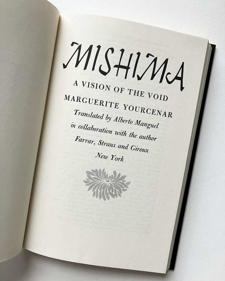 Yourcenar, Marguerite. Farrar, Straus and Giroux, 1986 (Stated 1st Ed.). Hardbound. First published in Paris in 1980 as Mishima ou la vision du vide by Editions Gallimard. Translated by Alberto Manguel. Jacket photo by Eikoh Hosoe. An integral biography of the novelist, who at age 27 realized for the first time, while traveling abroad and standing on deck of a ship, that he was a physical being made of flesh, an epiphany that would go on to shape his disciplined and highly aesthetic vision. Lovely design to this edition, with chrysanthemum fleuron uniting jacket, front board, and headings, by Cynthia Krupat, who Wayne Koestenbaum described as 'the Edith Head of book design' and Maurice Sendak called 'the greatest designer living'.