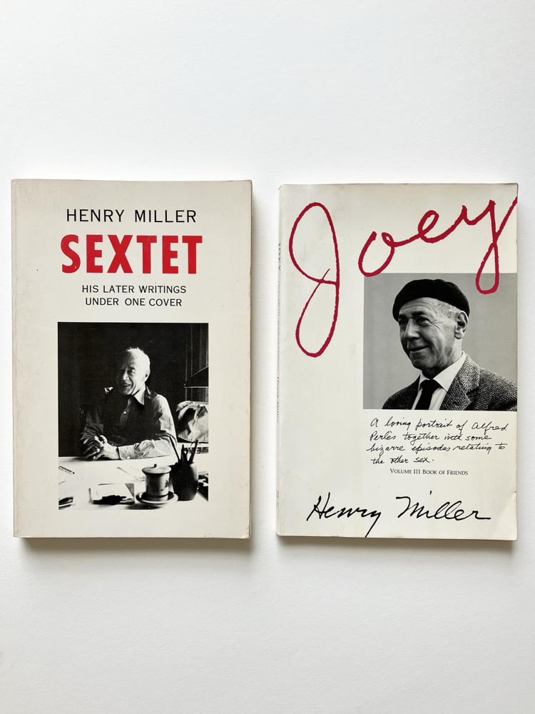 Two later works by Miller, both issued by Noel Young's Capra Press, which also published titles by luminaries including Anaïs Nin, Raymond Carver, and Ursula K. Le Guin. Sextet compiles pieces covering subjects ranging from Yukio Mishima to Jakob Wassermann. And Joey, Volume III of Miller's Book of Friends, is a reprise that builds off of his earlier work as it explores the writer's relationship with former roommate Alfred Perlès (Miller was in turn a subject of at least two Perlès texts: Henry Miller at Villa Seurat and My Friend Henry Miller).